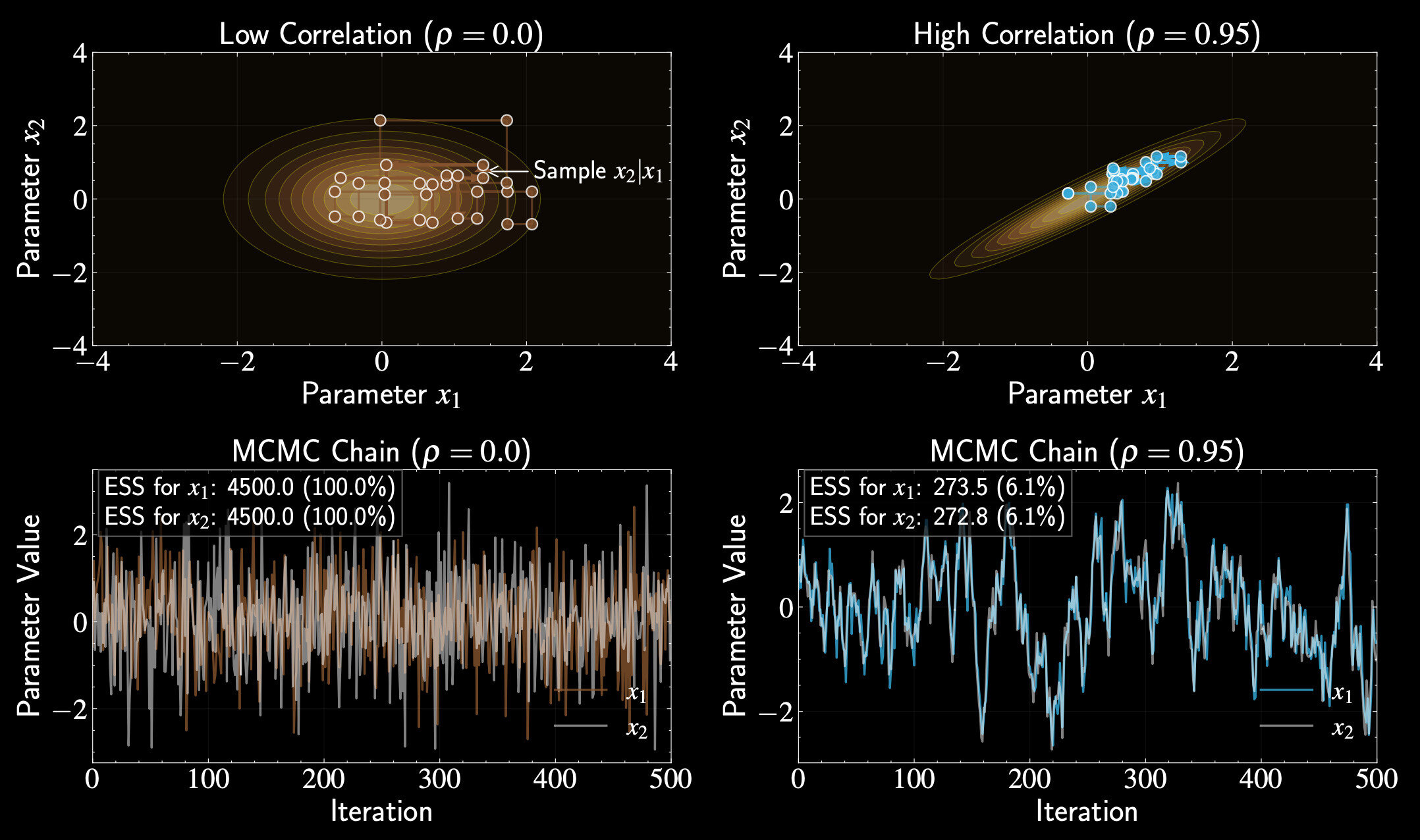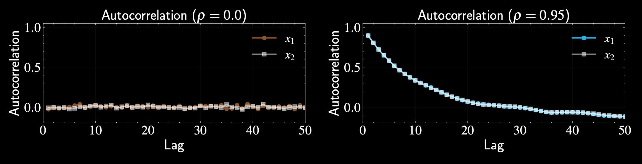 p(x_1 | x_2) = \mathcal{N}(\rho x_2, 1-\rho^2), \quad p(x_2 | x_1) = \mathcal{N}(\rho x_1, 1-\rho^2)
